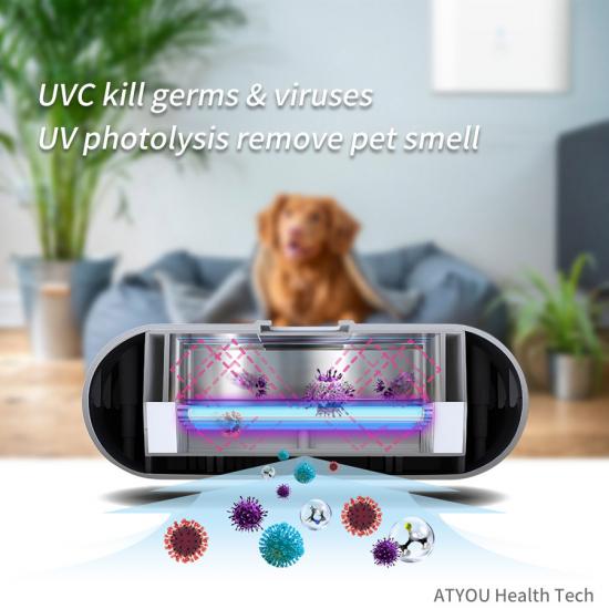 ATYOU pet UVC germicidal air sterilizer. This air disinfection device is specially optimized for pet living spaces. It uses the ozone-free UVC air purification tech. It will kill bacteria and viruses all day automatically and will eliminate odorous substances through UV photolysis. This UVC light air purifier is ideal for all kinds of pet owner families, pet stores, pet nursery centers, and pet hospitals. With long-term use, it will effectively prevent the spread of diseases between pets or between pets and humans and will eliminate stubborn odors produced by pets living.